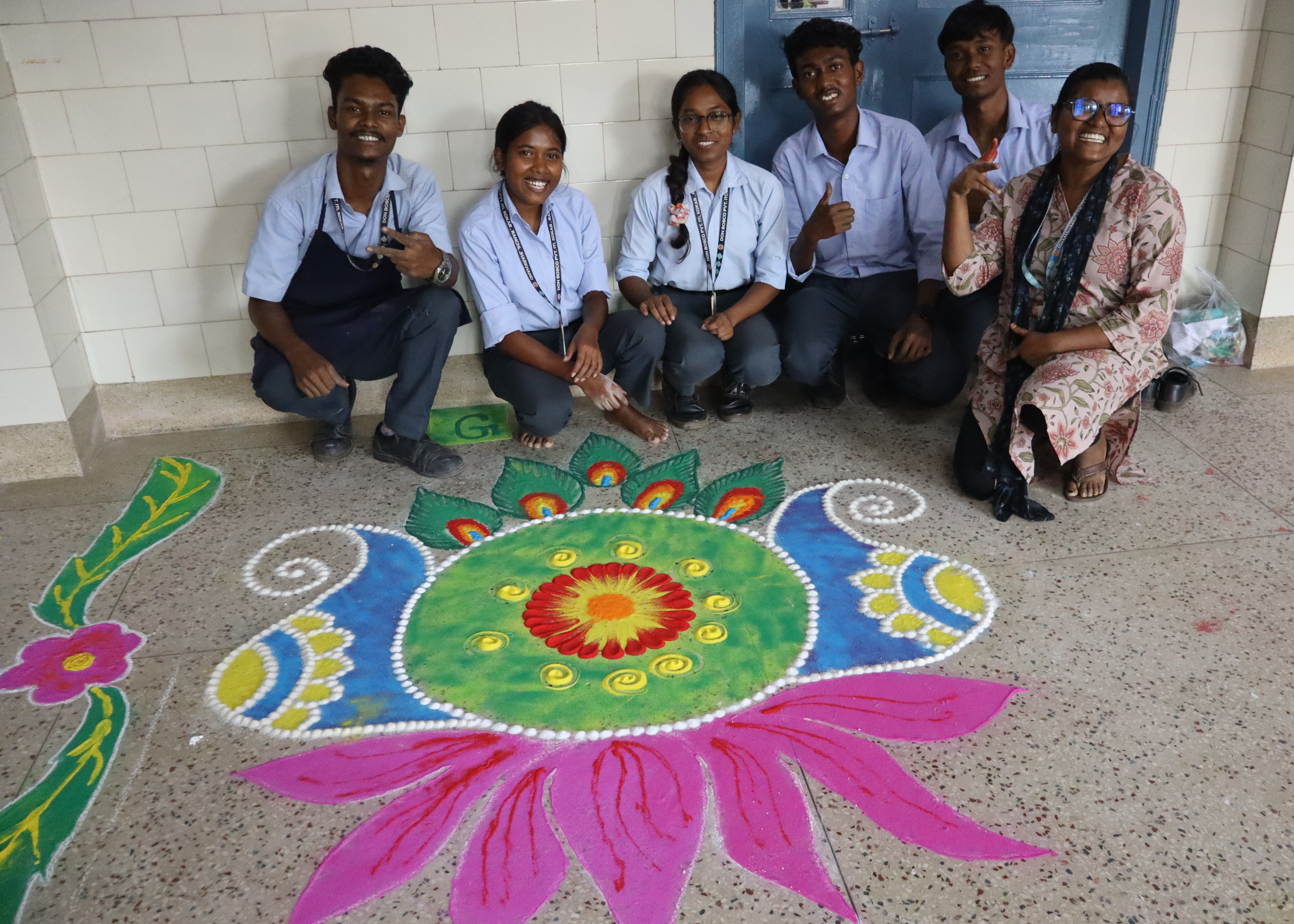 The afternoon featured a rangoli competition in which representatives from all four houses participated enthusiastically. The trainees displayed great creativity and imagination through their colorful designs. Green House emerged as the winner, followed by Blue House as the runner-up. The winners and runners-up were awarded attractive prizes. The Don Bosco Tech trainees also showcased their artistic talents with beautiful rangoli designs, adding to the festive spirit.